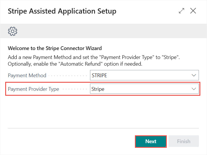 If you select an existing Payment Method then set the Payment Provider Type to Stripe on the Assisted Application Setup page, then click Next.