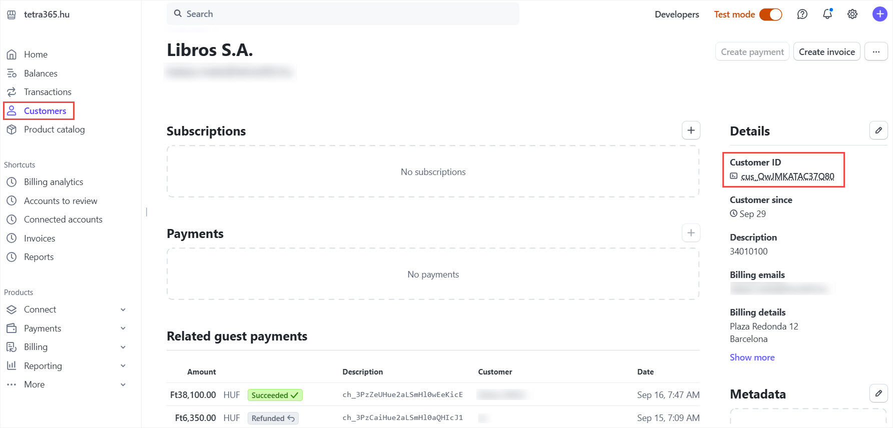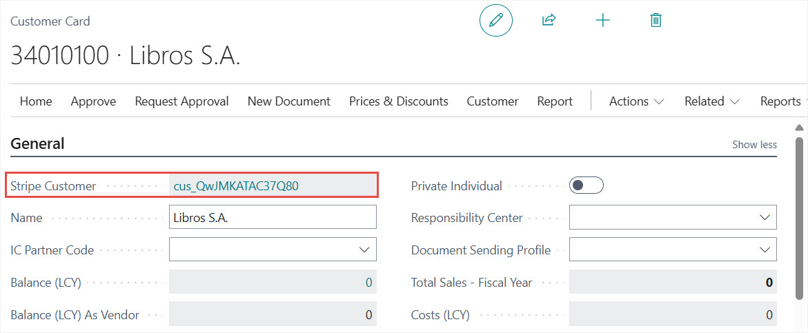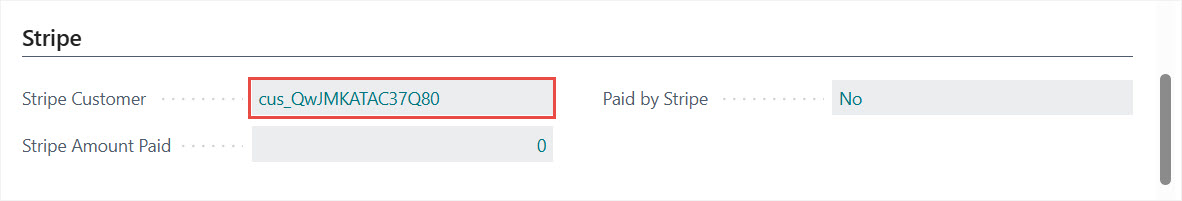 After Customer creation the Stripe Customer ID field is updated in Business Central. Stripe Customer ID is available on the Customer Card and on Sales Documents as well.