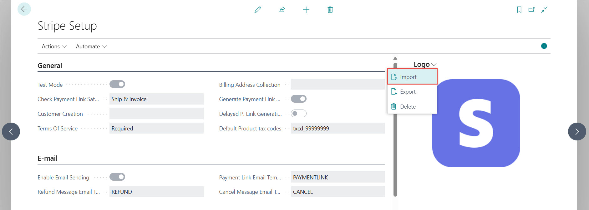 Its possible to set up a custom logo which will be visible on sales document layouts. In the Logo FactBox click on the Import action to set a new logo.